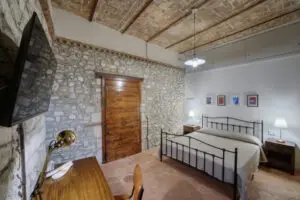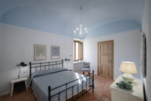 Camera da letto matrimoniale di 25 mq, dotata di bagno autonomo (box doccia, wc, bidet, lavandino e phon), sistema di climatizzazione (riscaldamento e raffrescamento) con